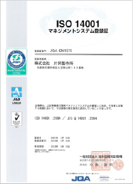 가타오카 제작소에서는 ISO14001 인증을 취득하였으며, 사장을 관리 총책임자로 하는 환경 관리 체제를 조직해 놓고 있습니다.